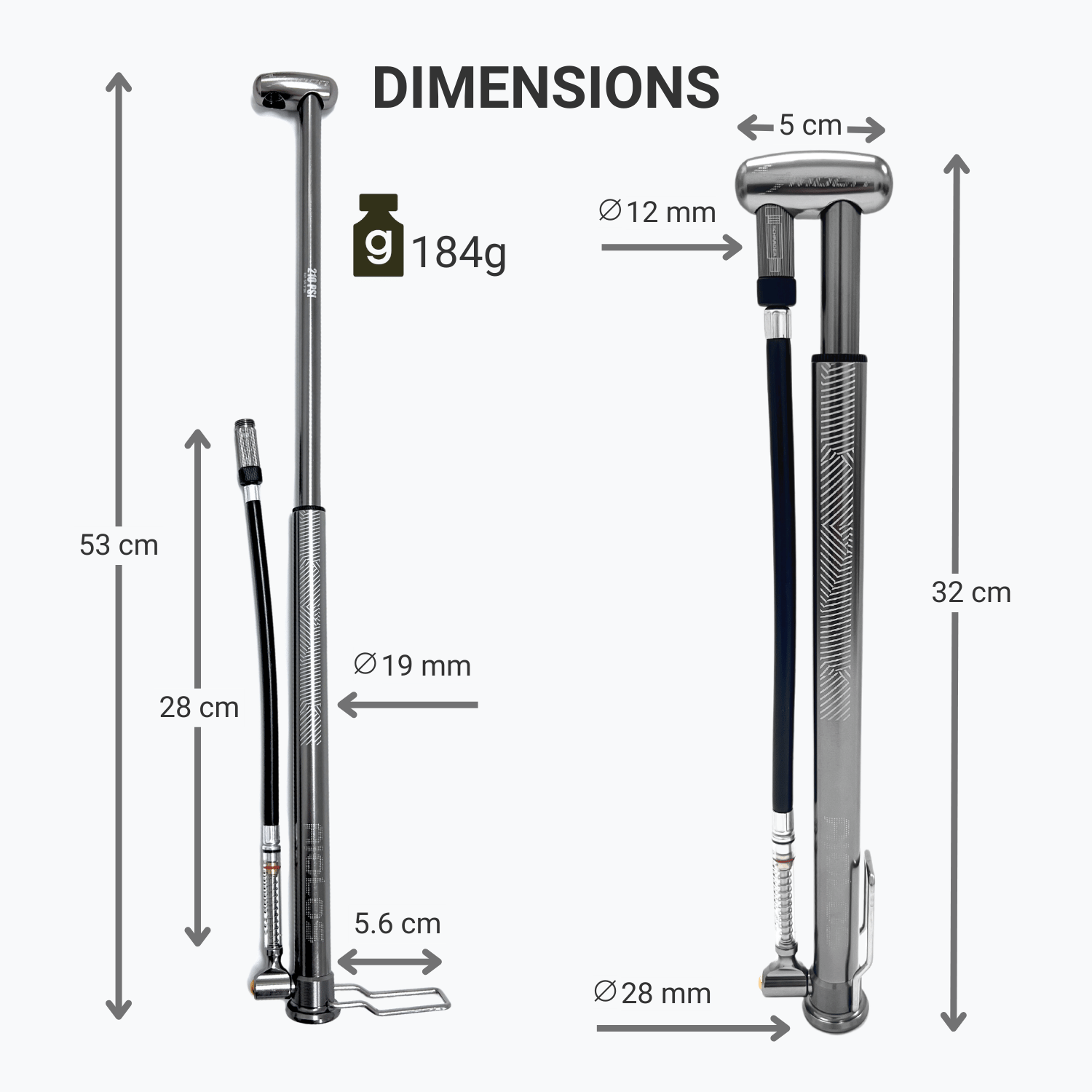 Mini floor pump with 210psi high pressure, air bleed control, inline gauge, lockable handle, CNC aluminum build, Presta/Schrader compatible.