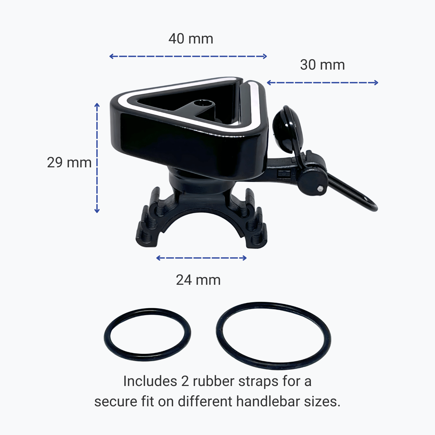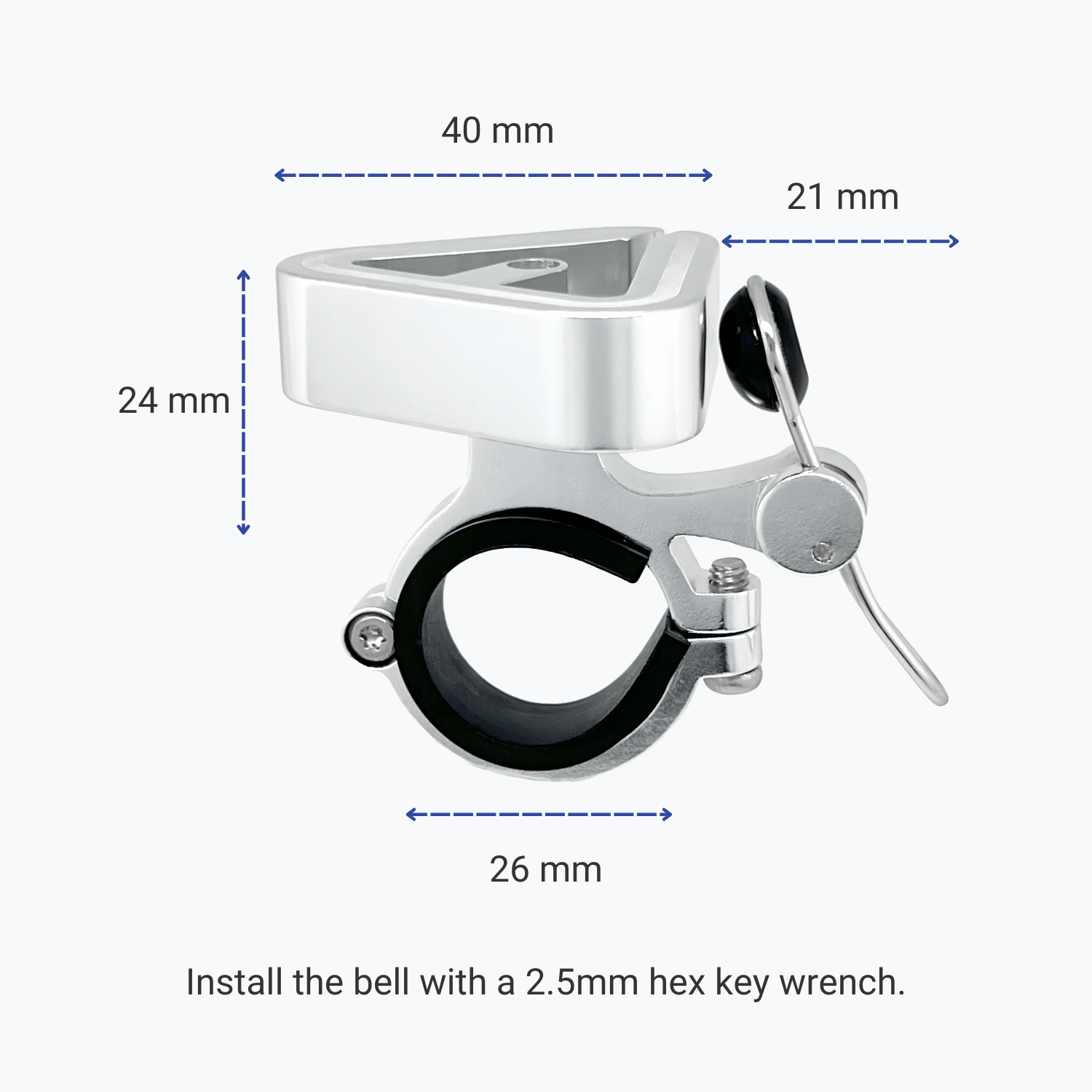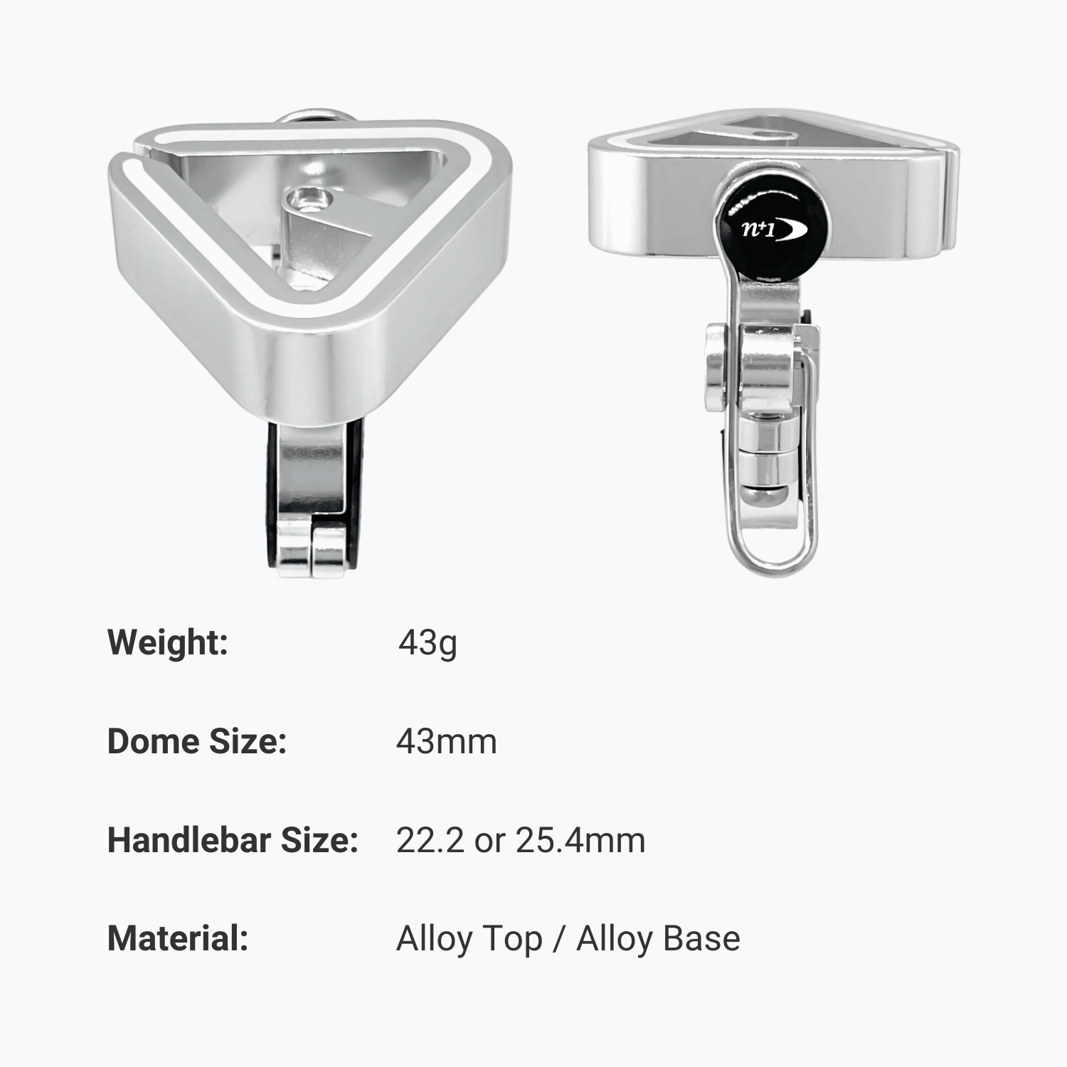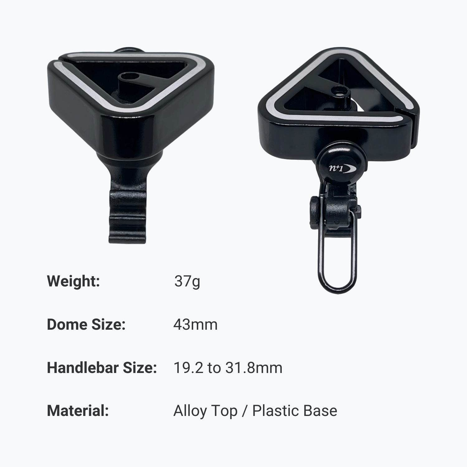 Alloy top, 43mm dome, loud lasting chime. Two models fit 19.2-31.8mm or 22.2/25.4mm bars. Lightweight with a patented triangle design.