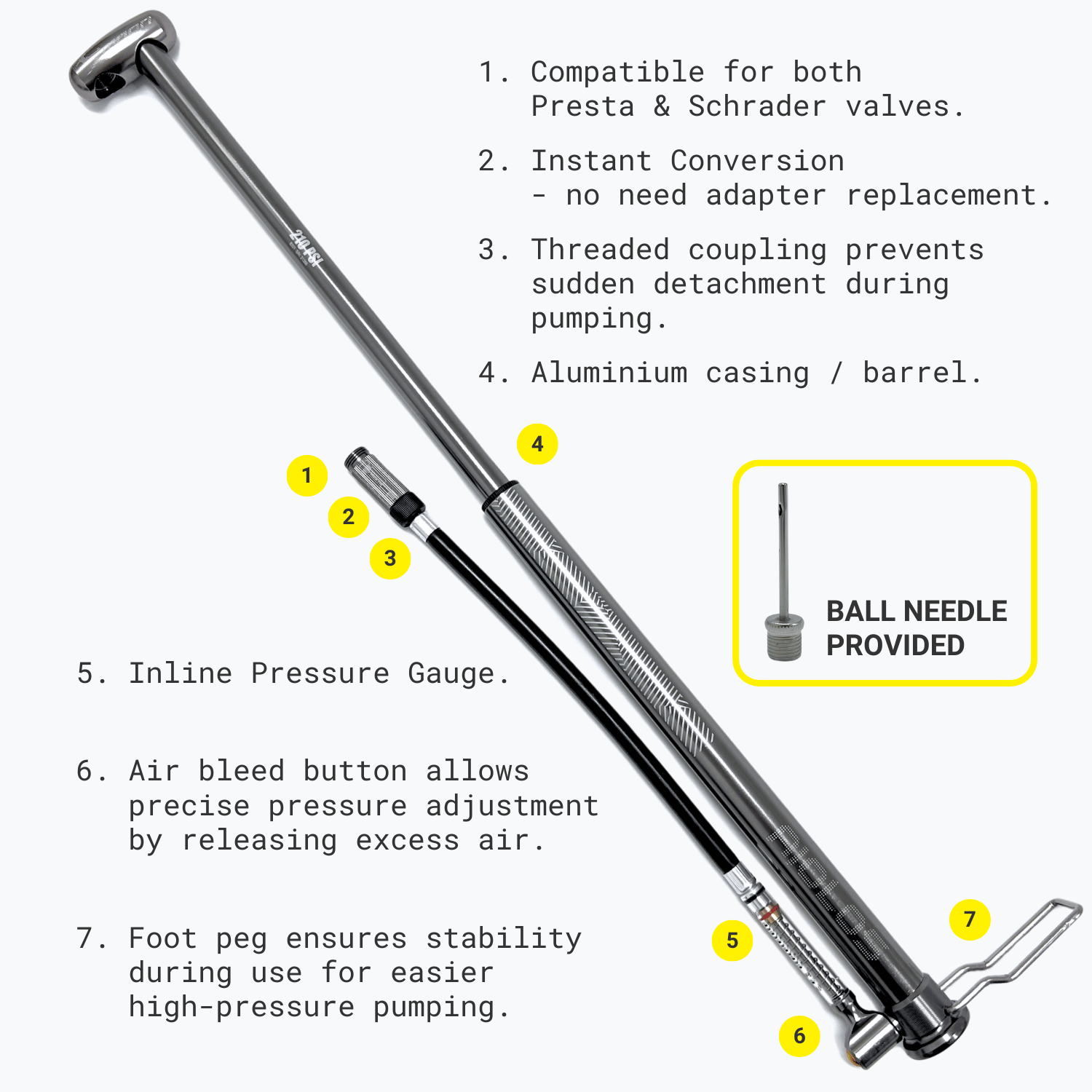 Mini floor pump with 210psi high pressure, air bleed control, inline gauge, lockable handle, CNC aluminum build, Presta/Schrader compatible.