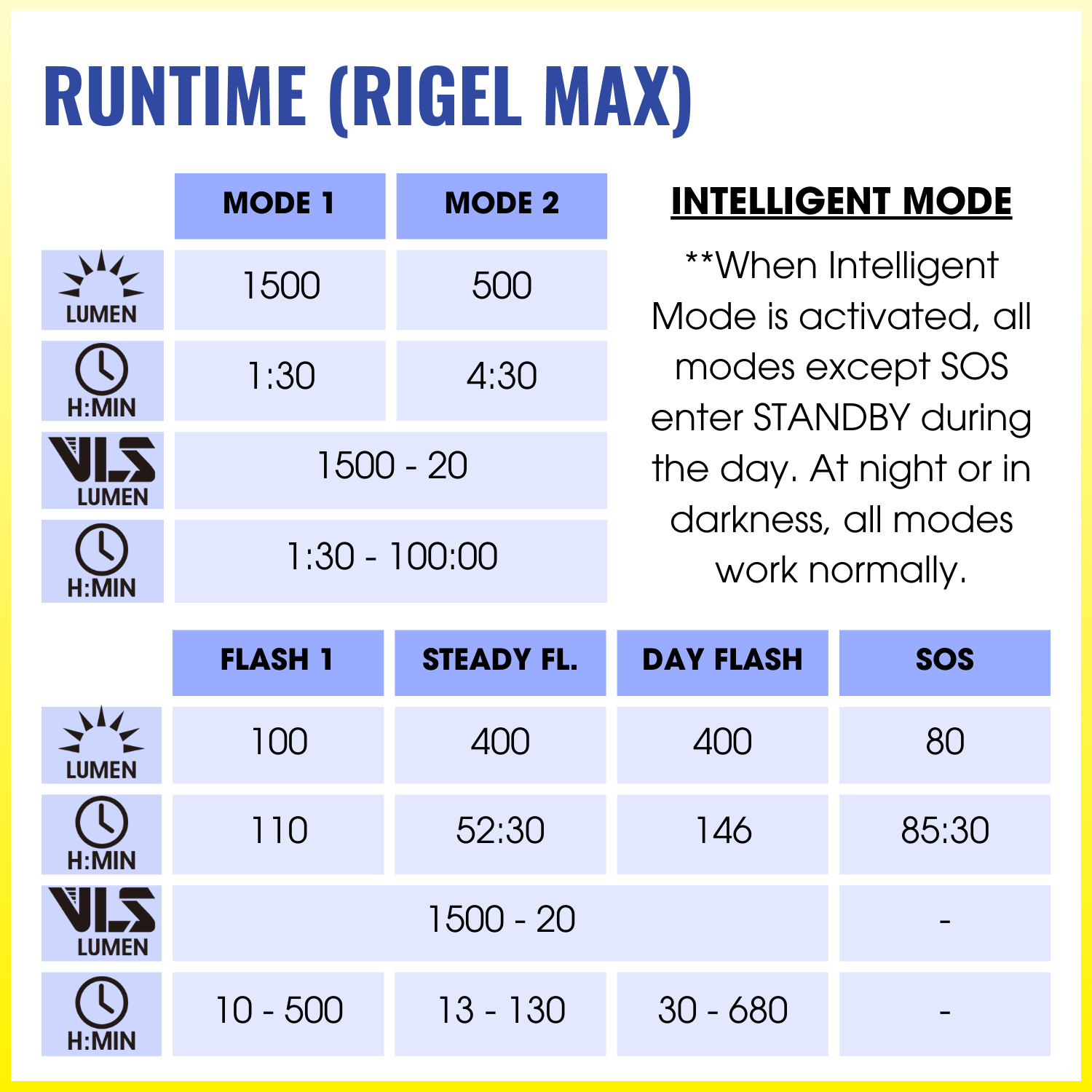 ➤ Max Steady Lumens : 1500LM (Runtime 1:30 hrs)