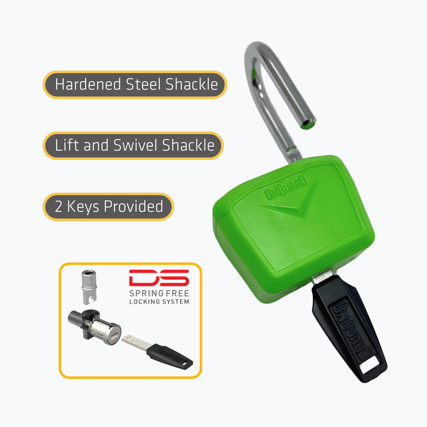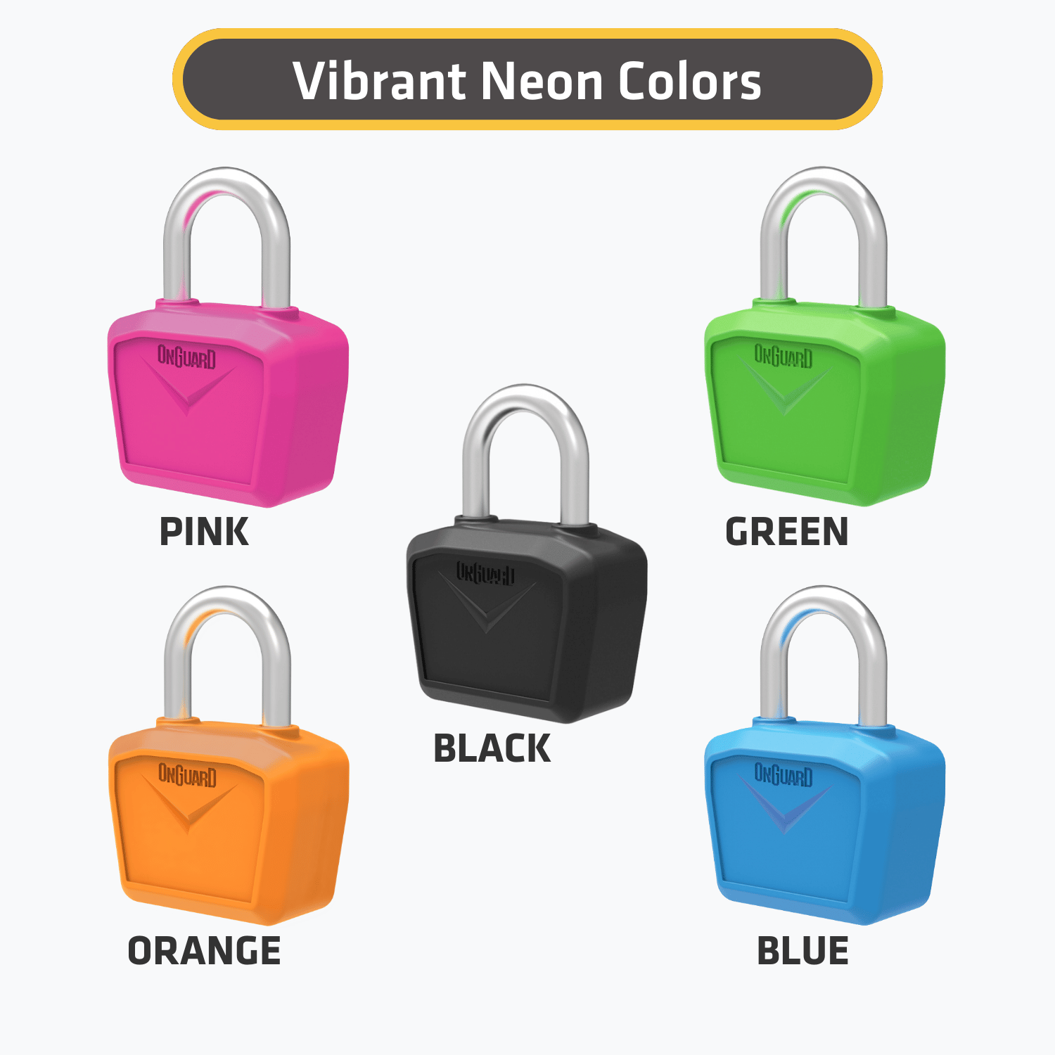 Secure with a durable key padlock in vibrant neon colors. Features hardened steel shackle, DS Spring-Free locking system to prevent jams. Comes with 2 keys.