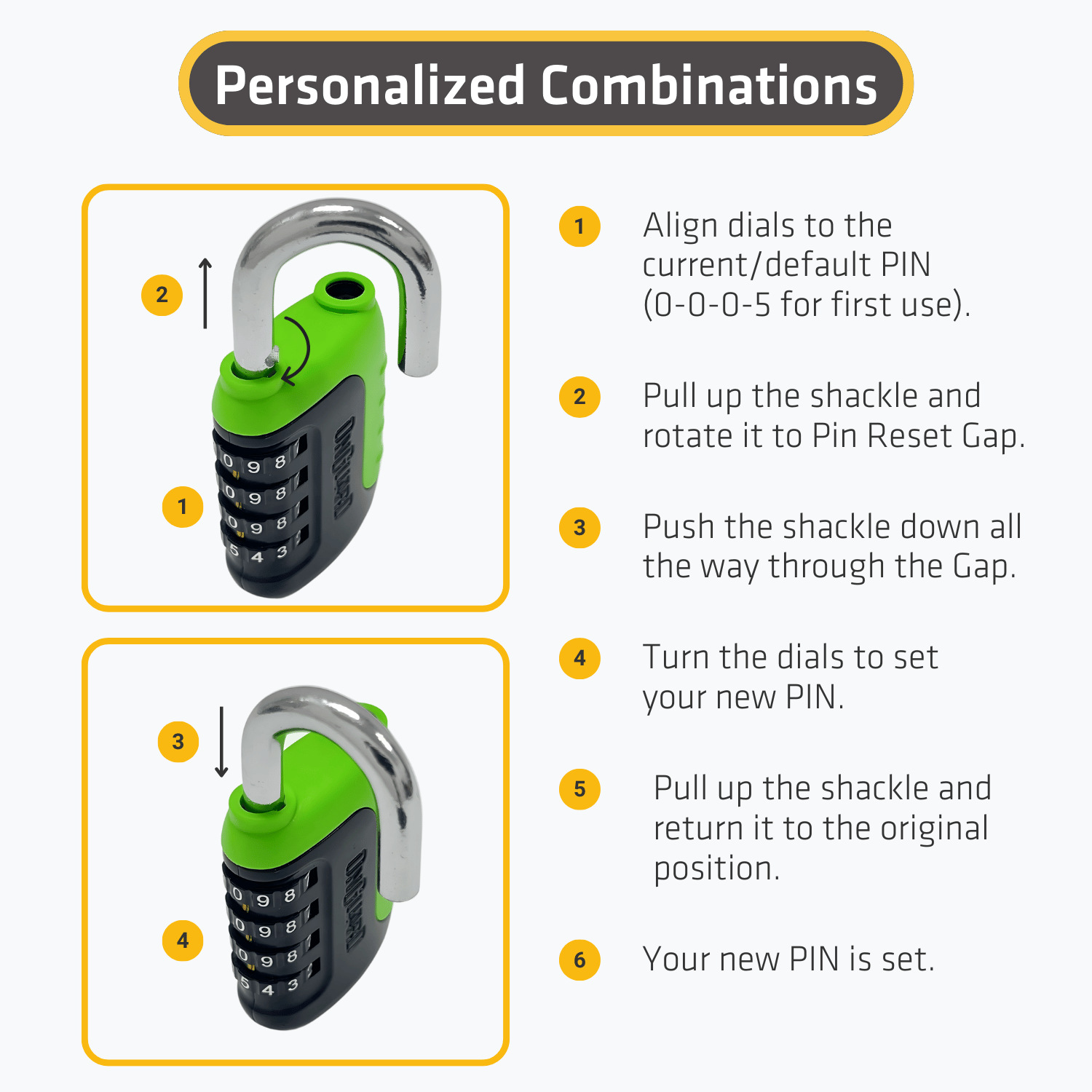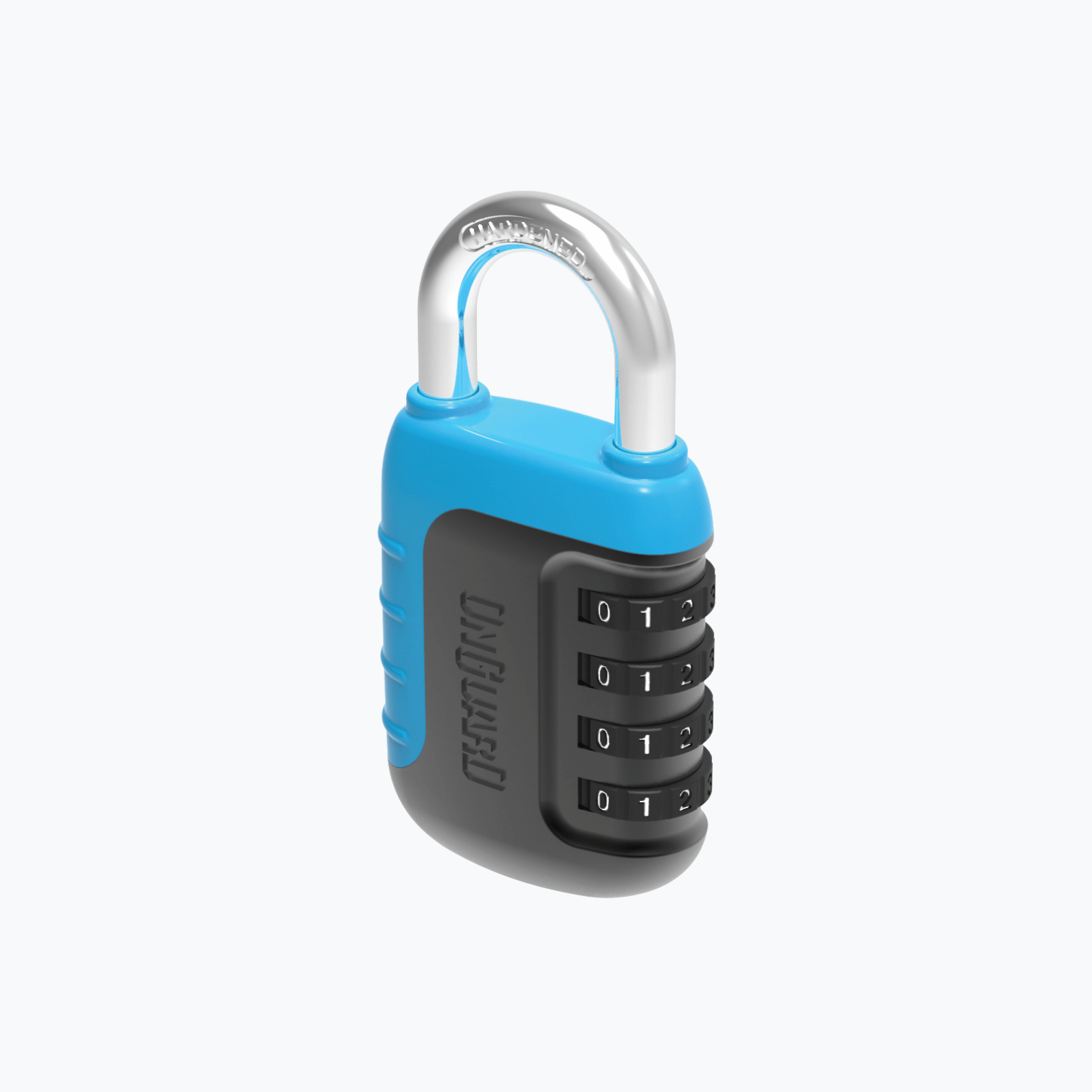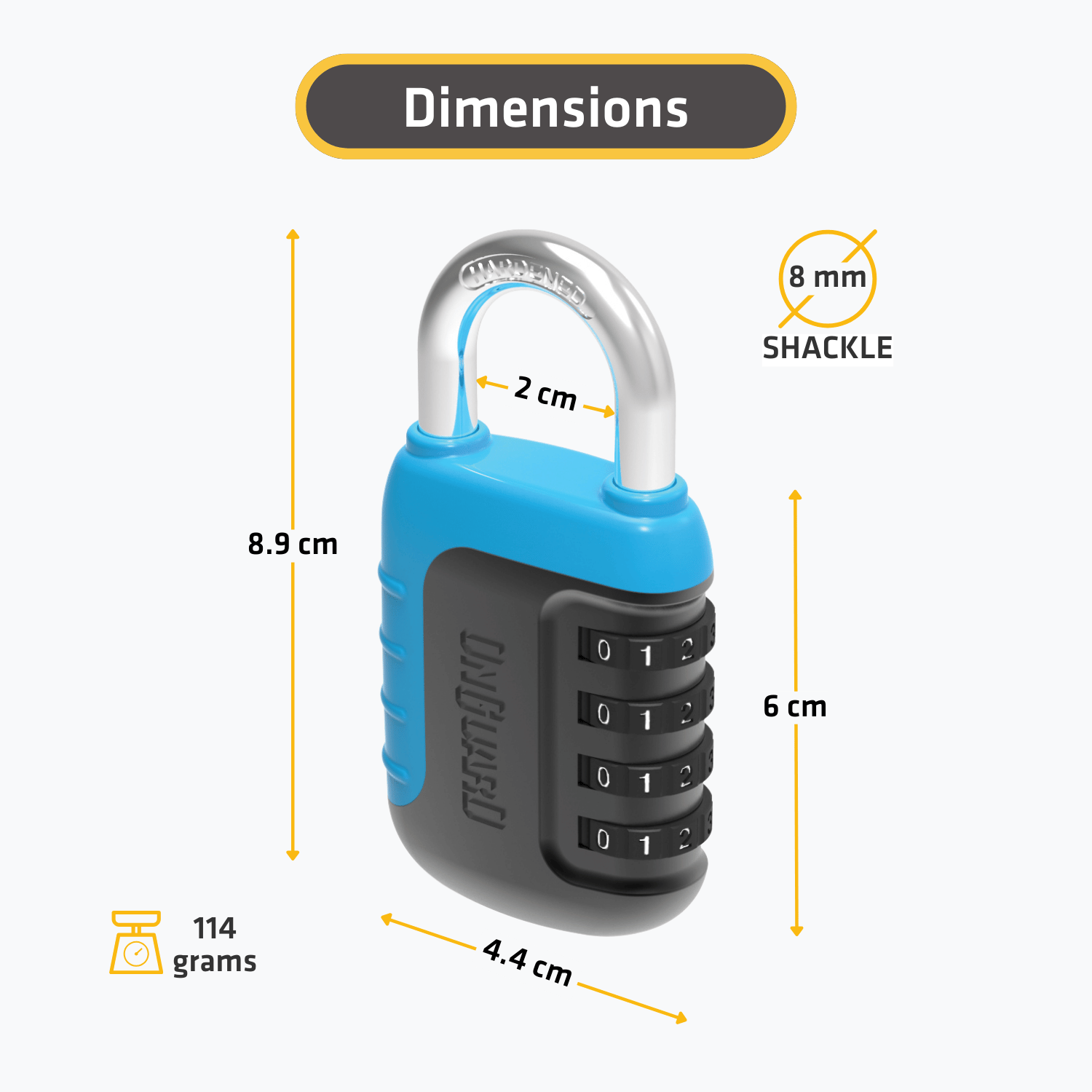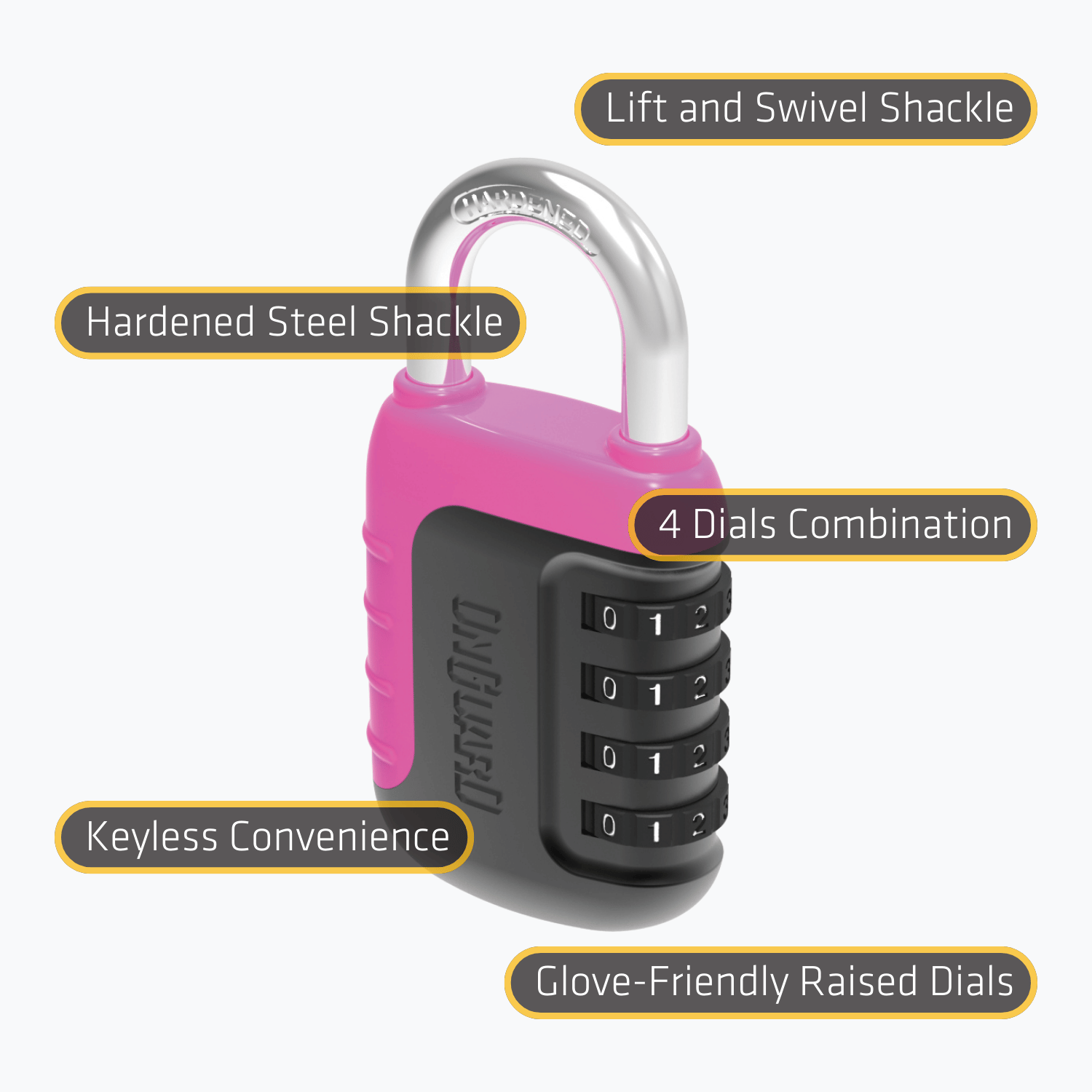 Secure with keyless convenience: 4-dial personalized combos, glove-friendly dials, vibrant neon colors, and a hardened steel shackle.