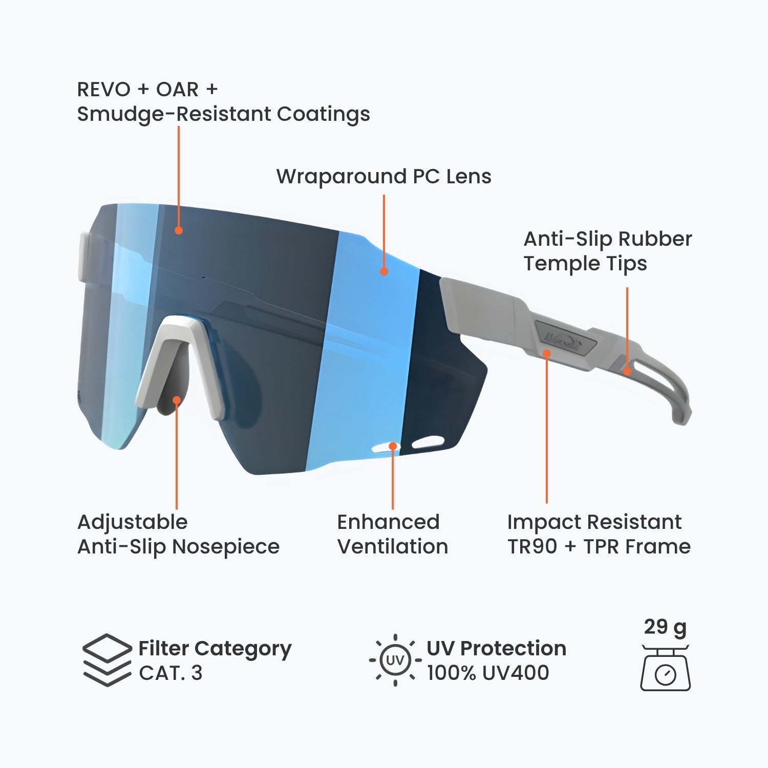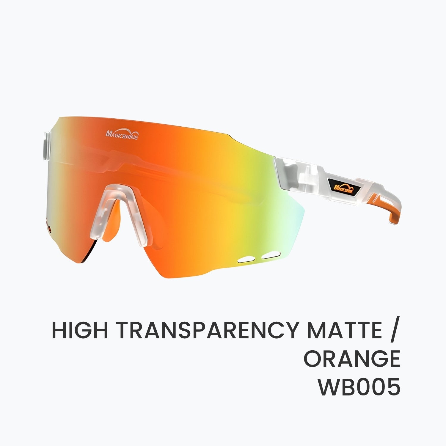 WINDBREAKER is Magicshine’s pro-grade cycling eyewear for racing and daily rides. The ultralight, rimless wraparound PC shield gives wide, protected vision. Lens and temple vents boost airflow to cut fogging and drag. A stress-resistant TR90/TPR frame holds its shape, while grippy nose pads and temple tips keep the fit secure and comfortable even when you sweat.