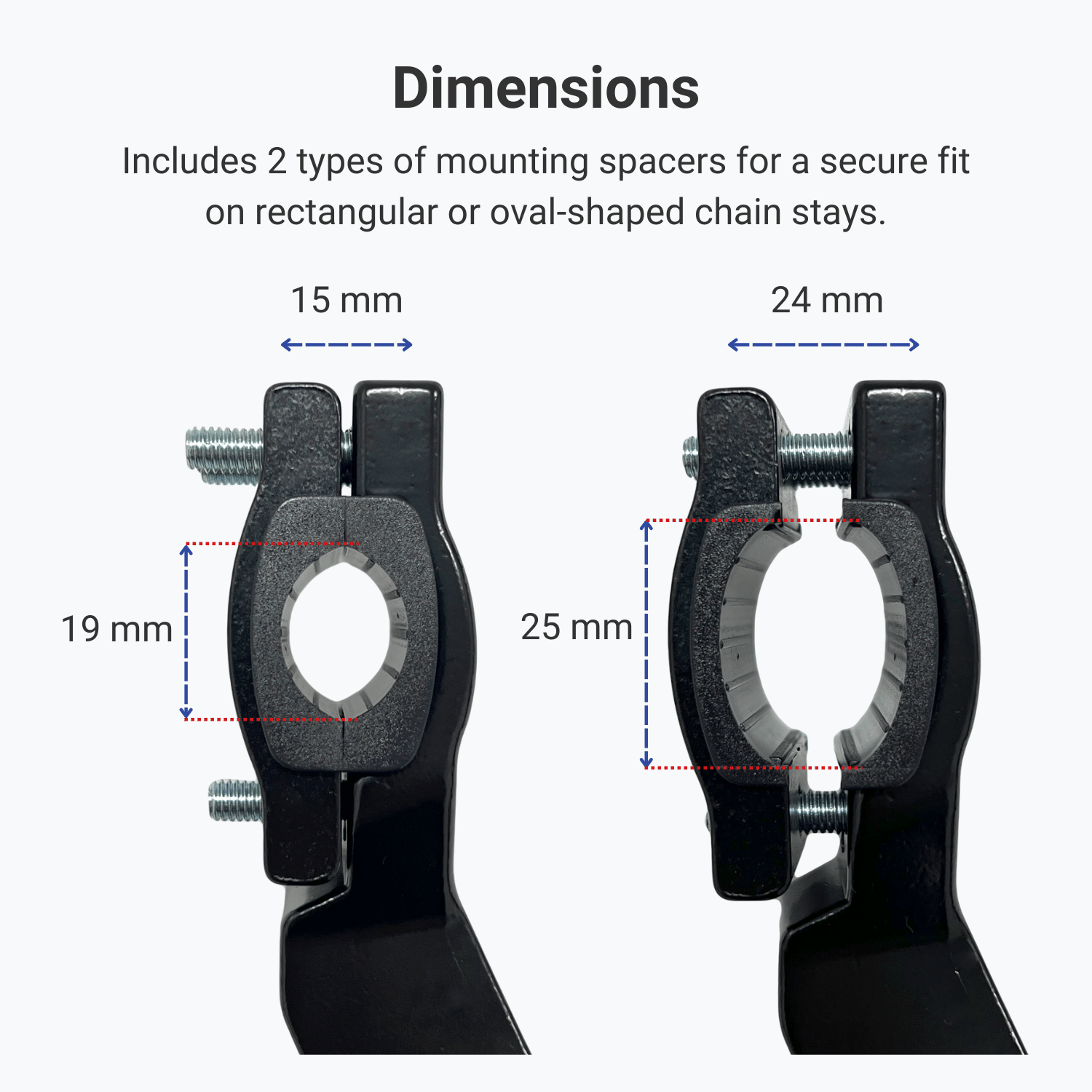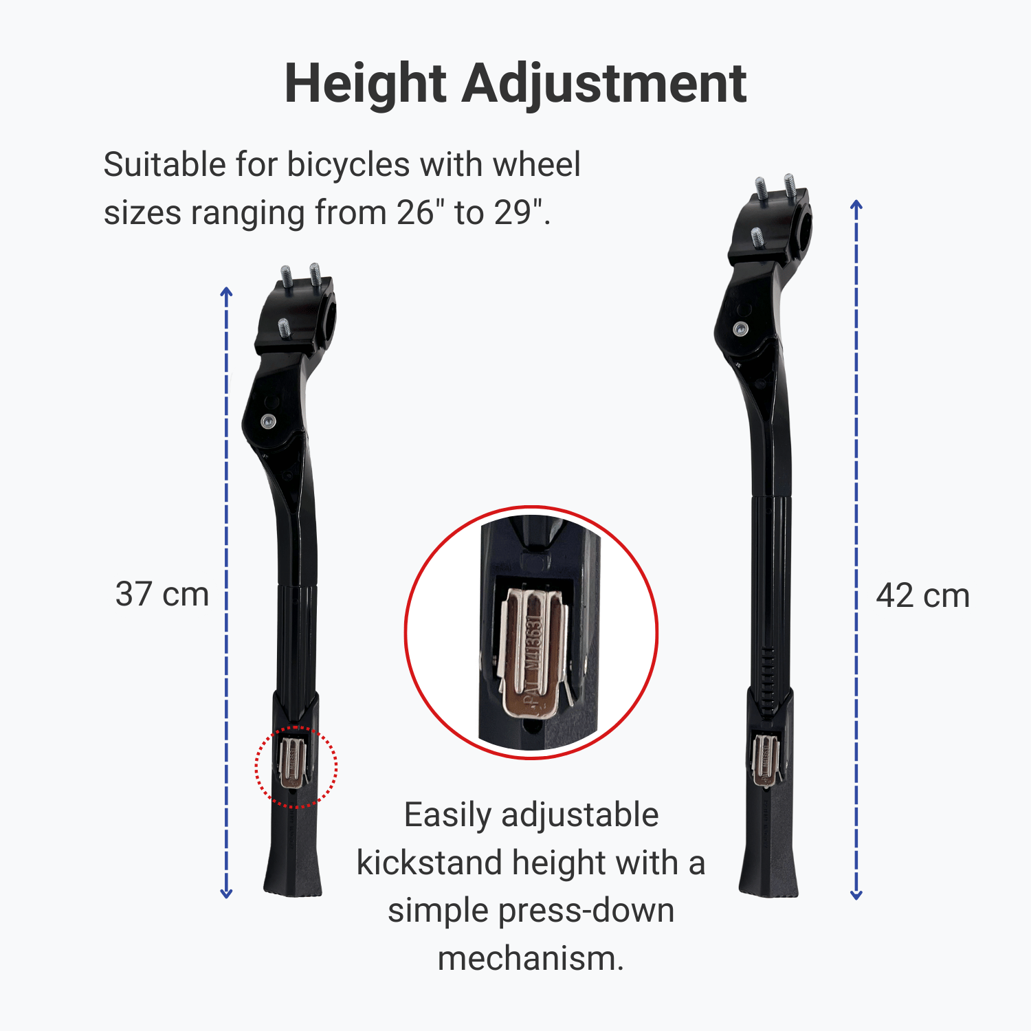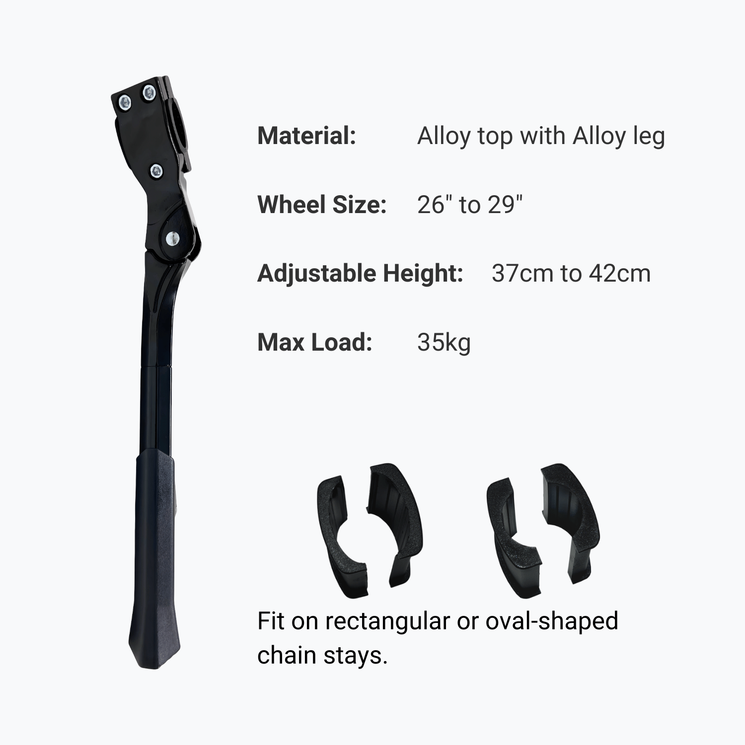 Durable alloy design, fits 26"-29" bikes, adjustable height (37-42cm), max load 35kg, fits rectangular & oval chain stays.