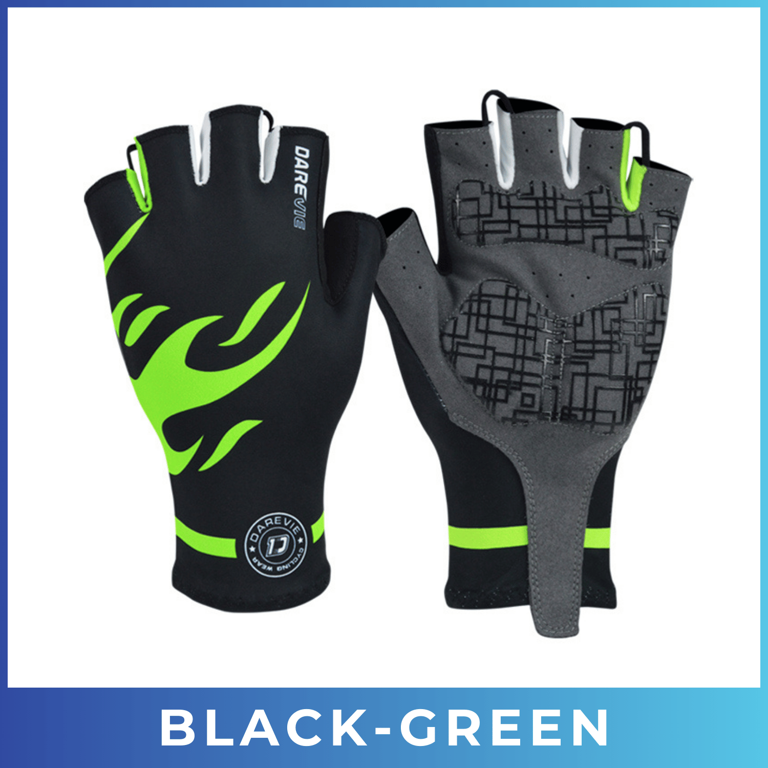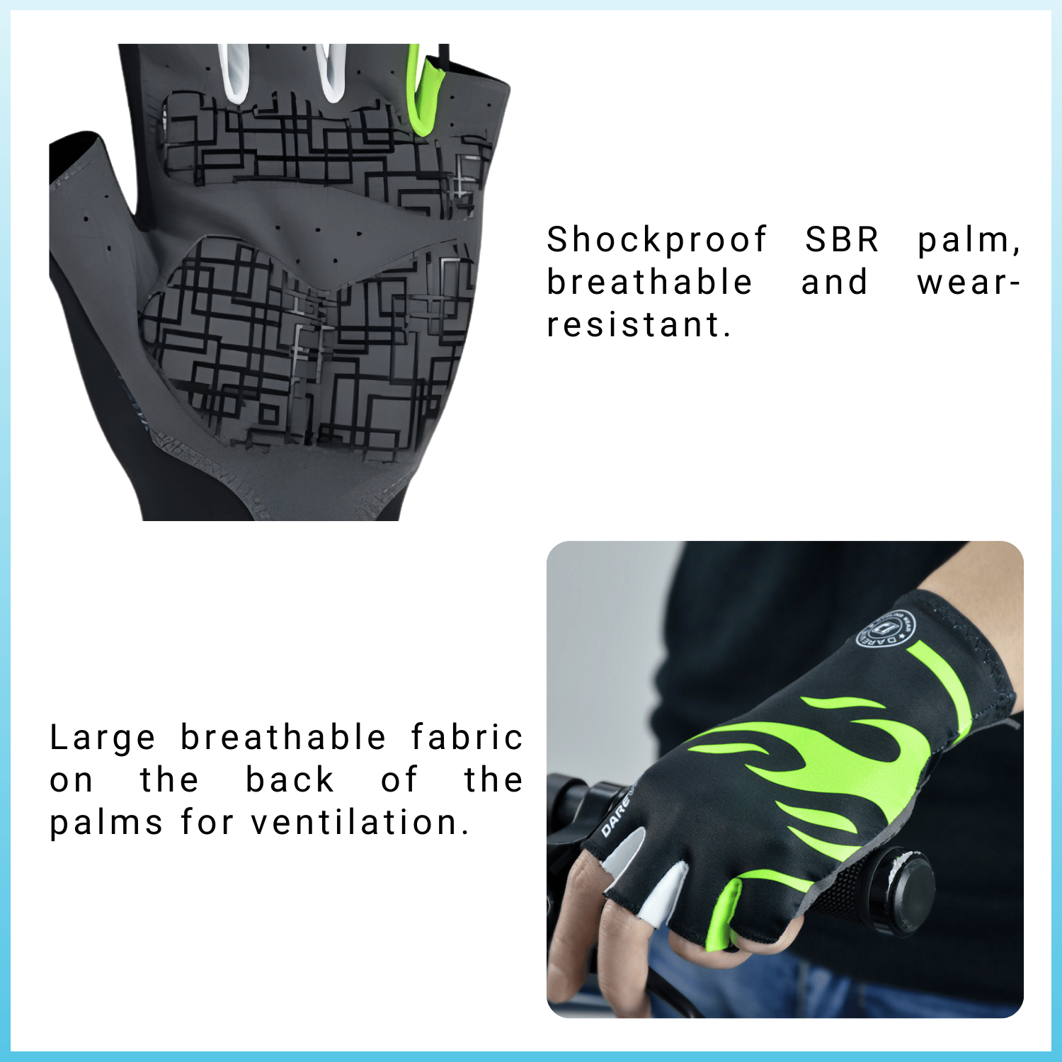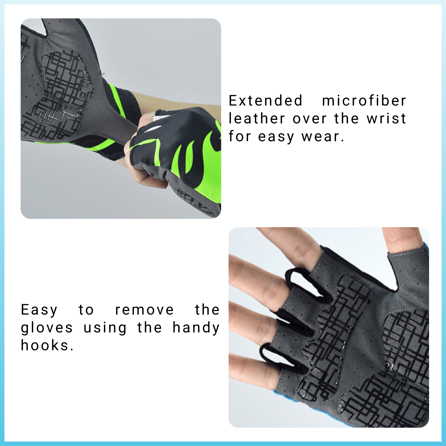 Cycling gloves in 4 colors, Size S to 2XL, featuring shockproof SBR palms, breathable fabric, enhanced strength & durability and handy removal hooks.