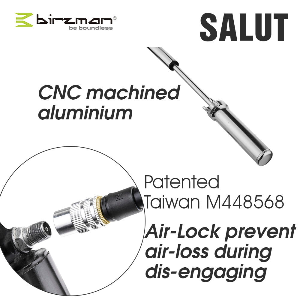 The Salut shock pump is equipped with 1.6” gauge with pressure release button, ensuring precise air pressure adjustments. The threaded valve adapter screws onto a Schrader valve on the shock in one easy step and follows the same process when disconnecting. The shock pump features Birzman's patented 'Air-lock' function, designed to prevent air loss when disconnecting the valve from the shock.