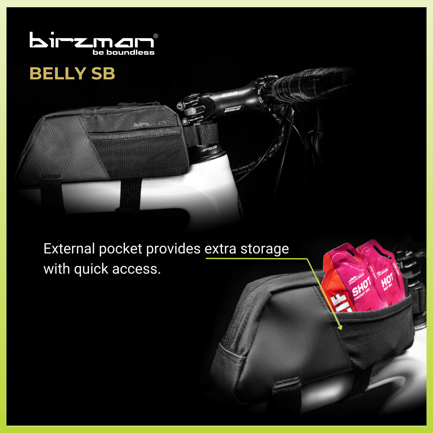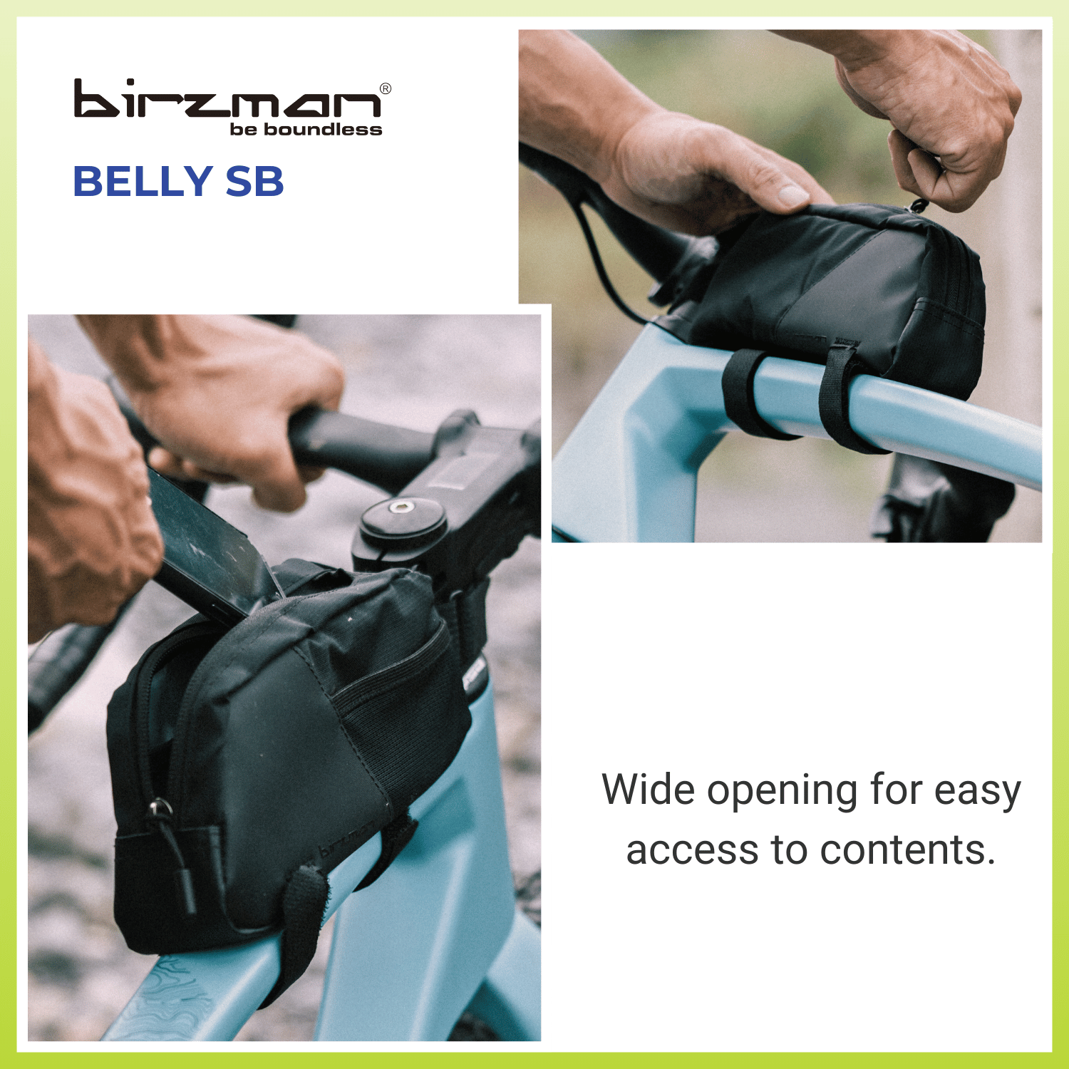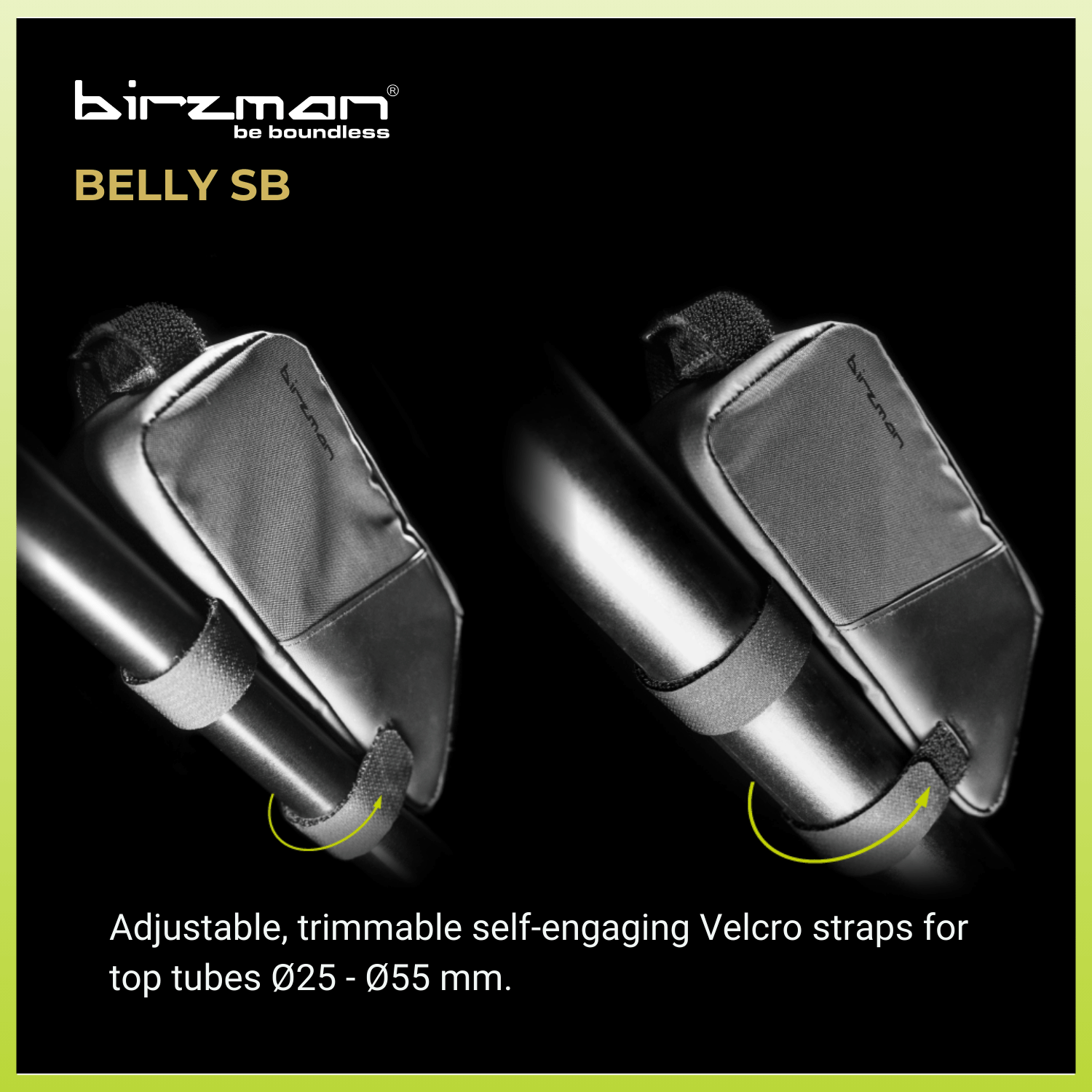 All-black top tube bag with a wide opening, quick-access external pocket, and narrow design. Adjustable self-engaging Velcro straps fit top tubes Ø25 - Ø55 mm.