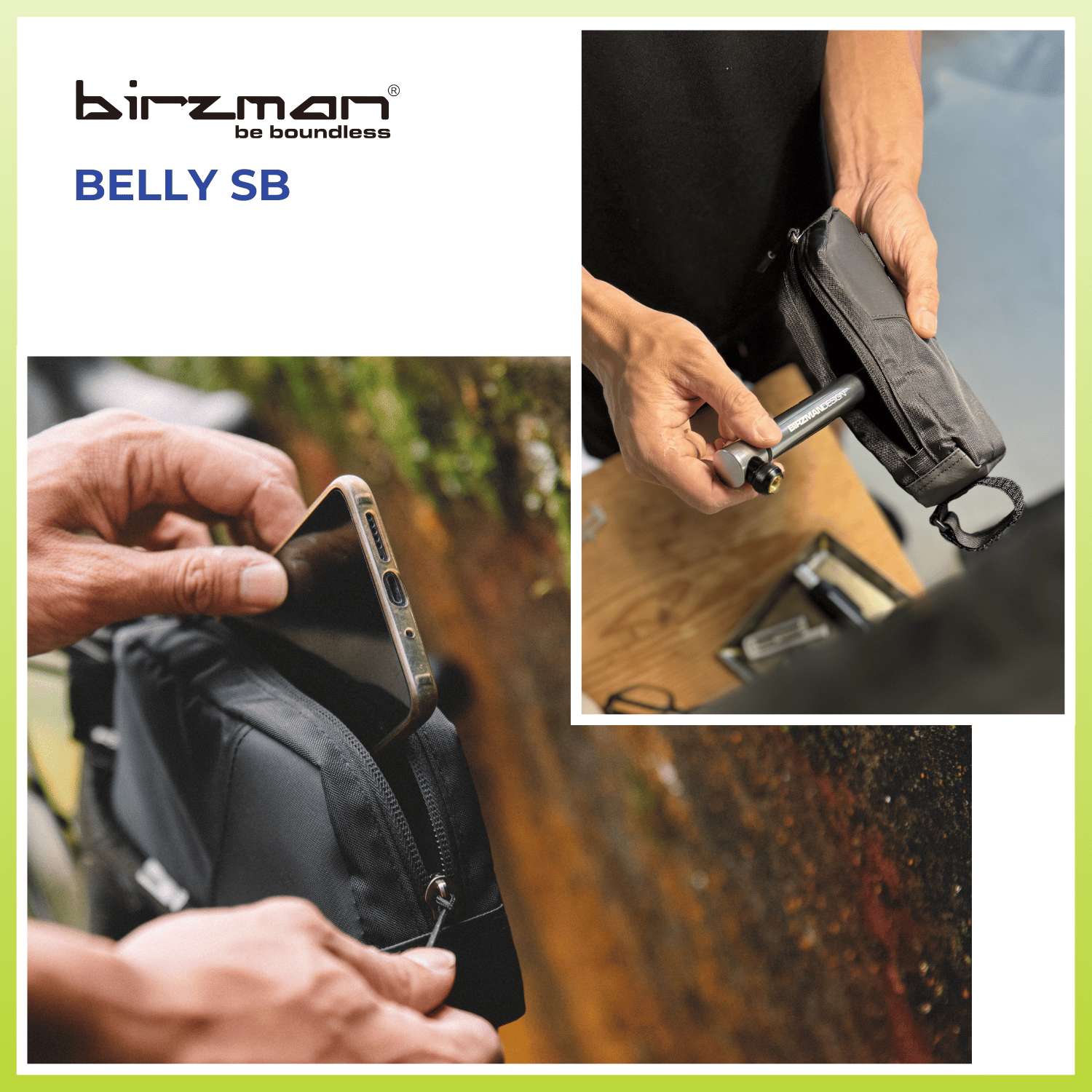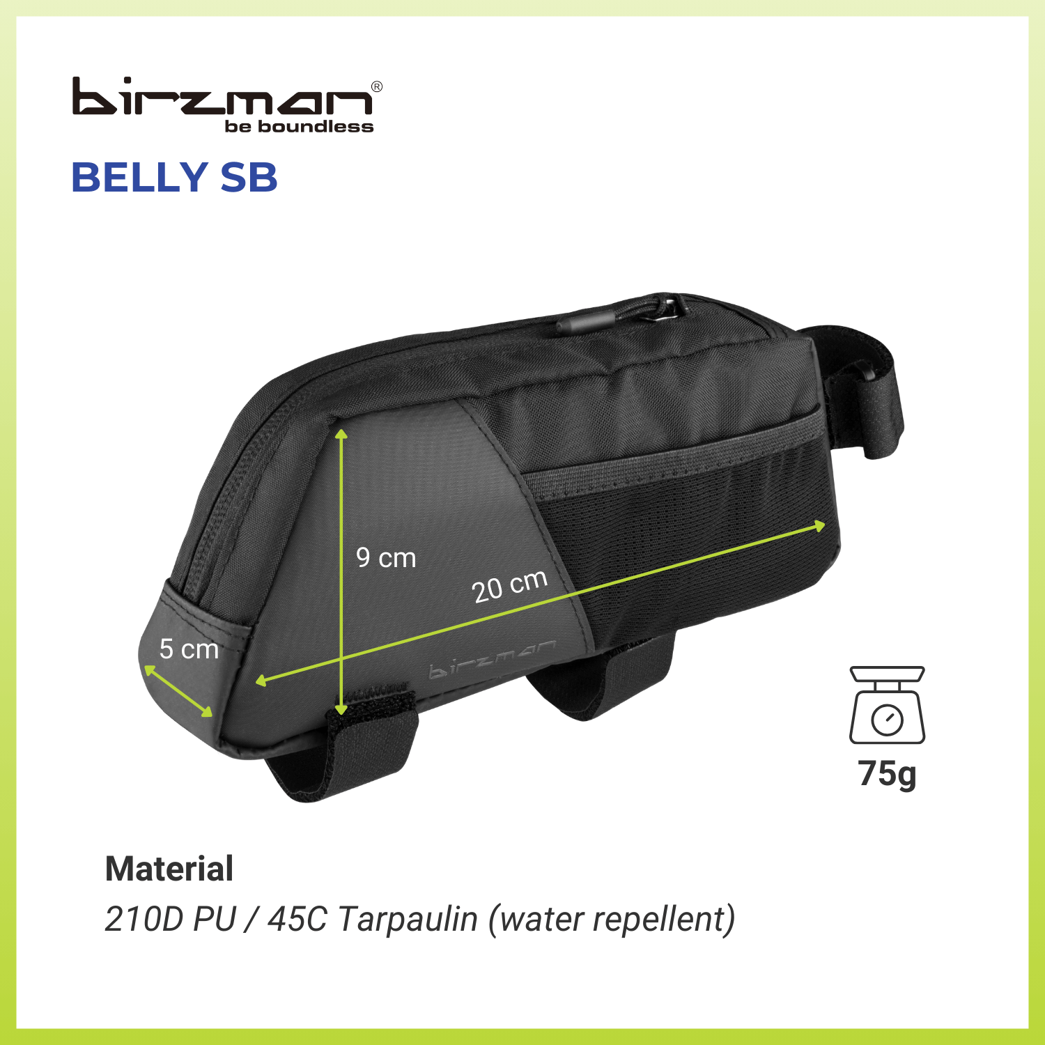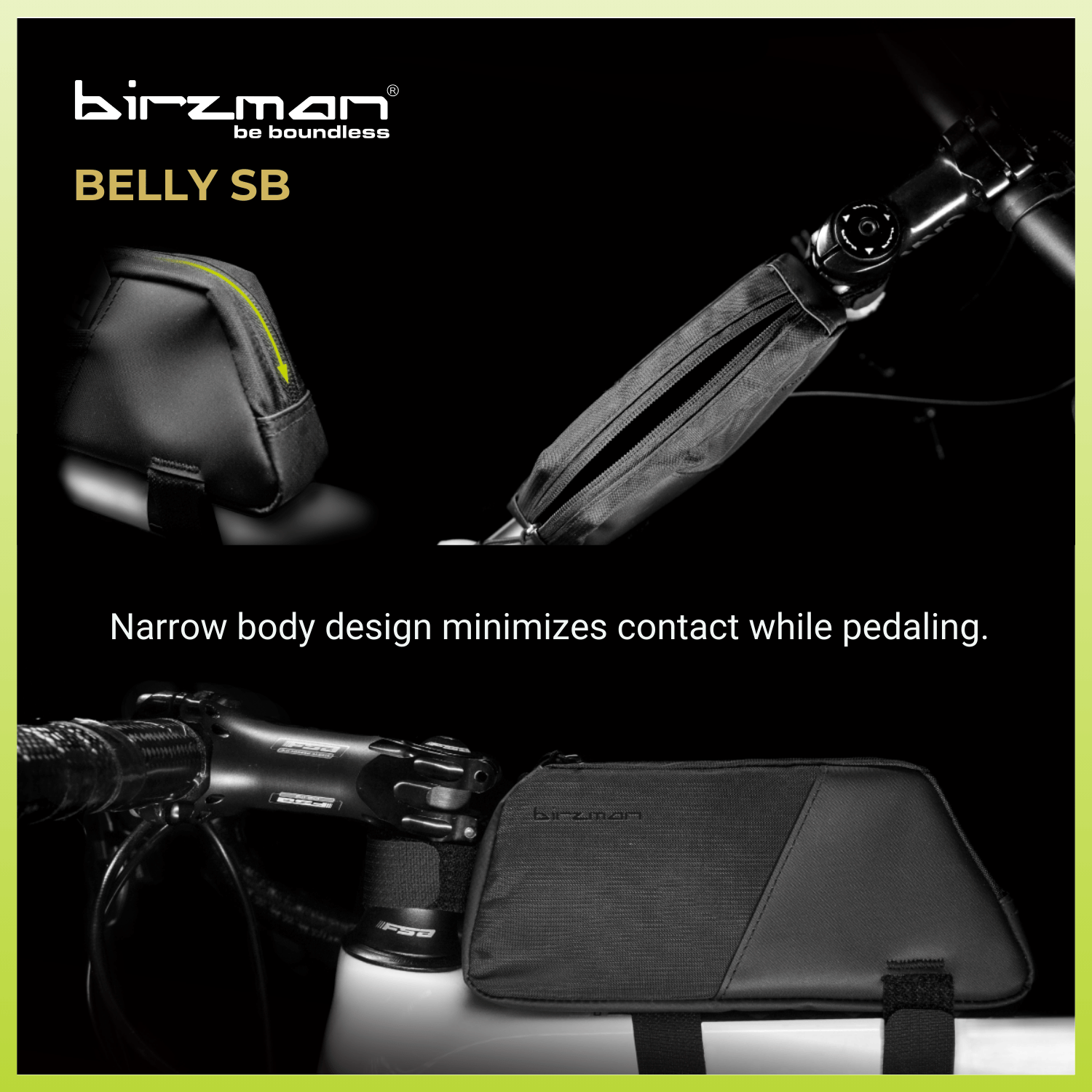 All-black top tube bag with a wide opening, quick-access external pocket, and narrow design. Adjustable self-engaging Velcro straps fit top tubes Ø25 - Ø55 mm.