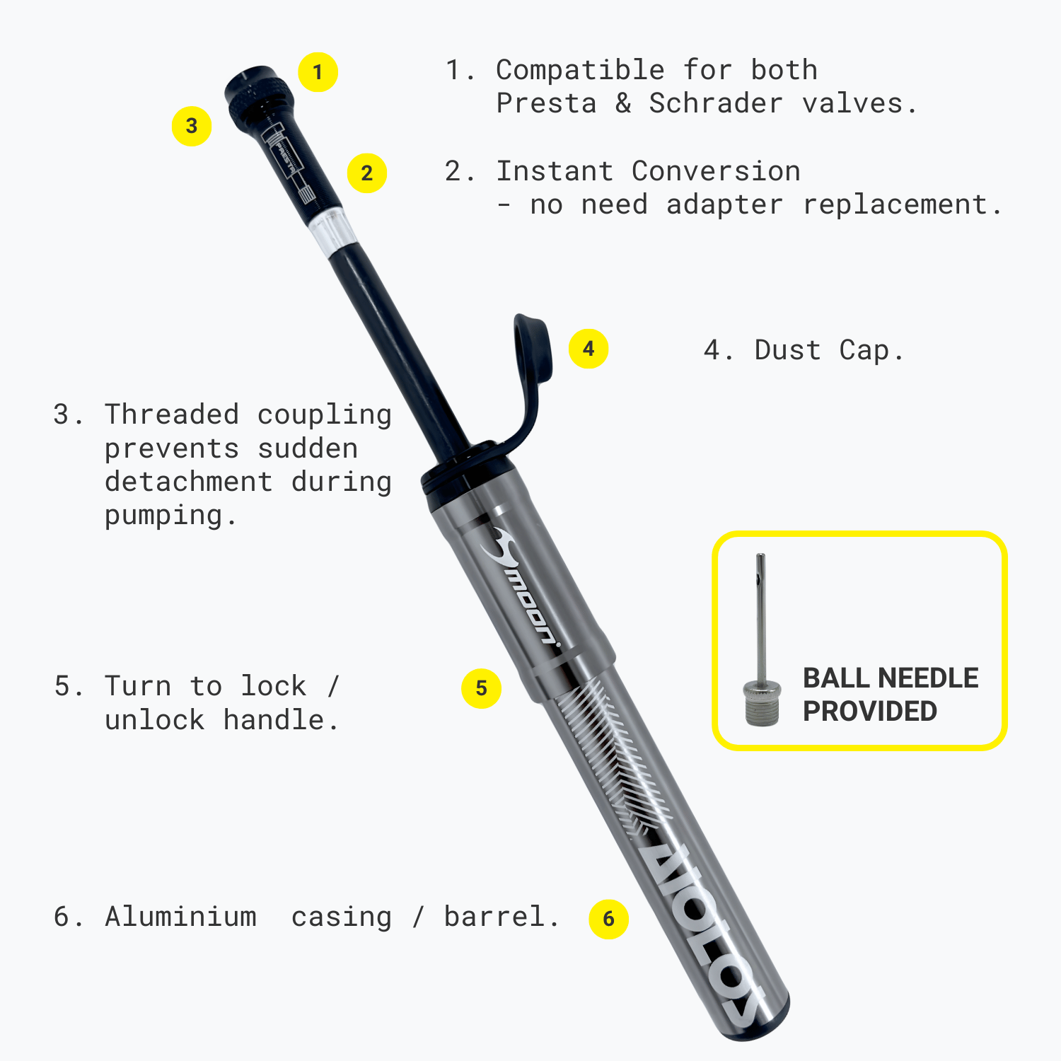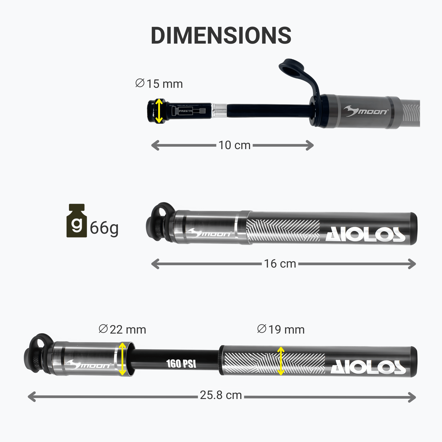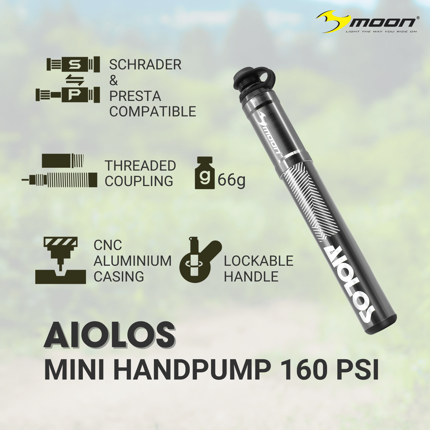 Compact 16cm bicycle mini hand pump, 66g, 160psi high pressure, CNC aluminum casing, lockable handle, Presta/Schrader compatible, threaded coupling.