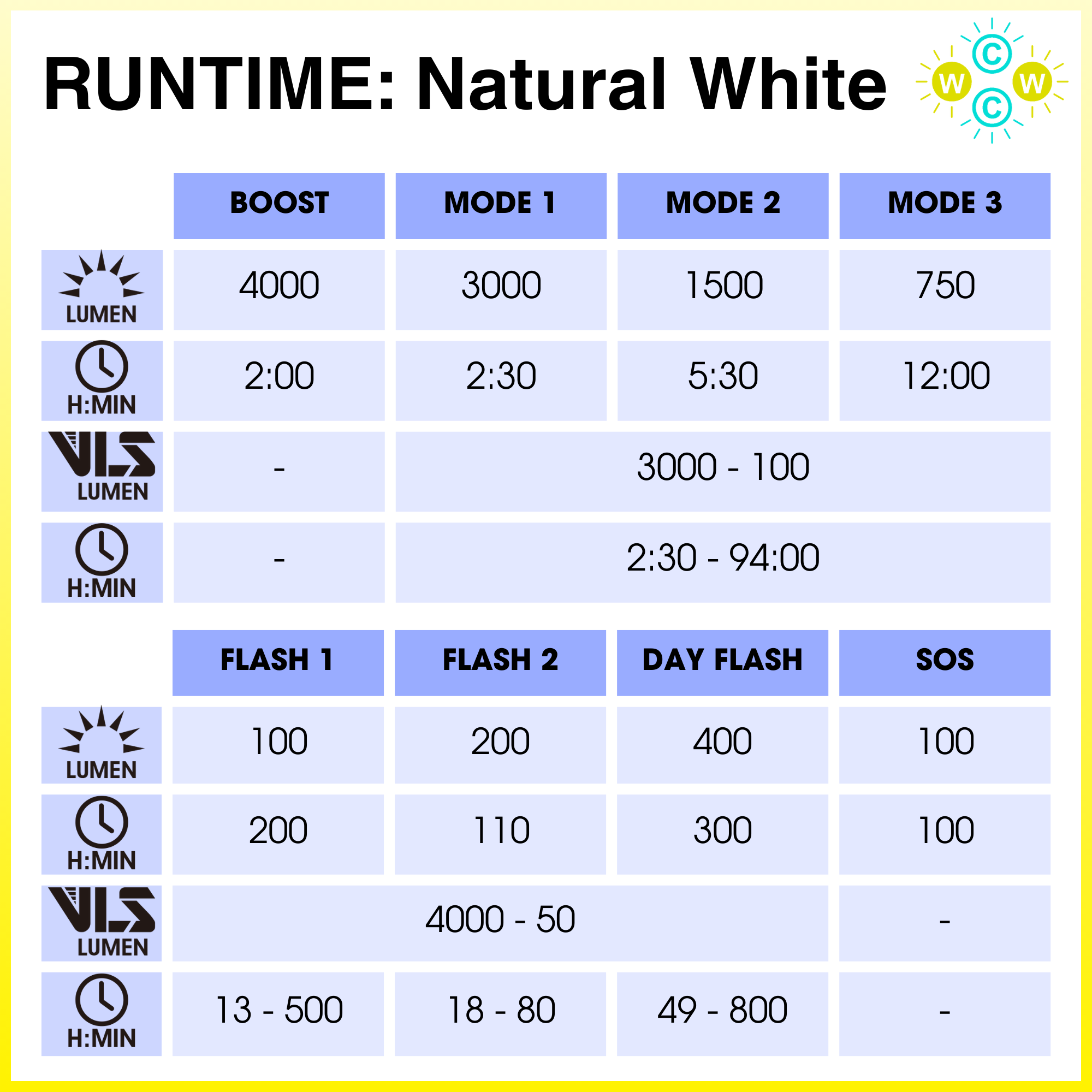 - Max Steady Lumens : 4000LM (Runtime 2 hrs)